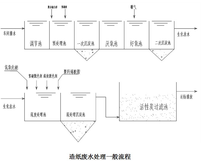 造纸废水处理应着重于提高循环用水率,减少用水量和废水排放量,同时也应积极探索各种可靠、经济和能够充分利用废水中有用资源的废水处理方法。例如:气浮法可回收白水中纤维性固体物质,回收率可达95%,澄清水可回用;燃烧废水处理法可回收黑水中氢氧化纳、硫化钠、硫酸钠以及同有机物结合的其他钠盐。中和废水处理法调节废水pH值;混凝沉淀或气浮可去除废水中大颗粒SS;化学沉淀法可脱色;生物处理法可去除BOD、COD,对牛皮纸废水较有效。此外,国内外也有采用反渗透、超过滤、电渗析等造纸废水处理方法。